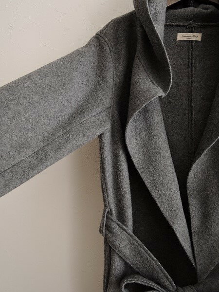 表記サイズ:F 実寸サイズ:肩幅41cm, 身幅50cm, 袖丈54cm, 着丈105cm, ウエスト幅50cm, ヒップ幅53cm, バックベント25cm (多少の誤差はご了承ください) 素材:本体-ポリエステル92%,毛8% 別布部分-ポリエステル80%,綿20% デザイン:Samansa Mos2 のウール混フード付き羽織コートです。